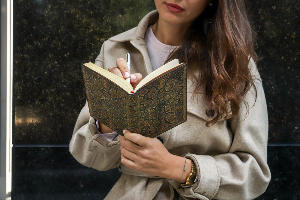 עיצוב האניגמה שלנו נוצר בהשראת כריכה שעוצבה על ידי לה גסקון, כורך ספרים אגדי אך לא מזוהה מהמאה ה-17. המקור היה עשוי מעור מרוקאי אדום מוטבע ומצופה בזהב ברוזטות, ספירלות וקווים מקווקווים, אך כאן השתמשנו ברקע שחור מרתק כדי להדגיש את מקורותיו המסתוריים.