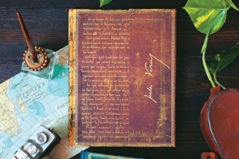 ז'ול ורן (1828–1905) הוא מחברם של כמה מהספרים המפורסמים ביותר בעולם. עיצוב זה של Paperblanks כולל עמוד מתוך טיוטת כתב ידו של ורן ליצירת המופת שלו "מסביב לעולם בשמונים יום", כאשר שער הרומן, שאויר על ידי אלפונס דה נוביל, מוצג על הכריכה האחורית.